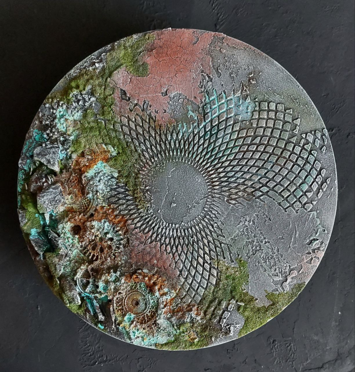 Мандала даёт тонкий контурный рисунок и при нанесении пасты смотрится, как вогнутое кружево. Особенно эффектно смотрится с поталью и металлизированными красками.